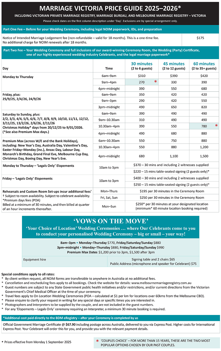 Part Two: Melbourne Marriage Registry – Ceremony Booking – Fee Schedule* (Additional cost to Part One fee)