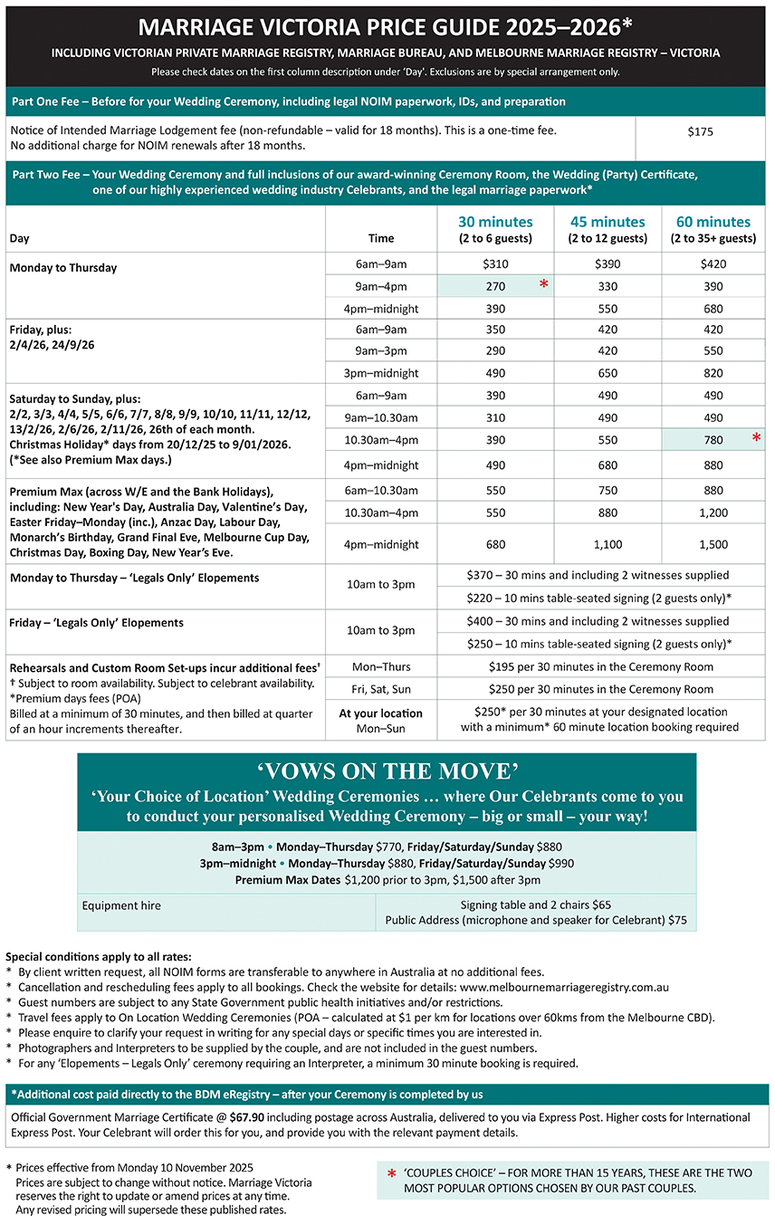 Part Two: Melbourne Marriage Registry – Ceremony Booking – Fee Schedule* (Additional cost to Part One fee)
